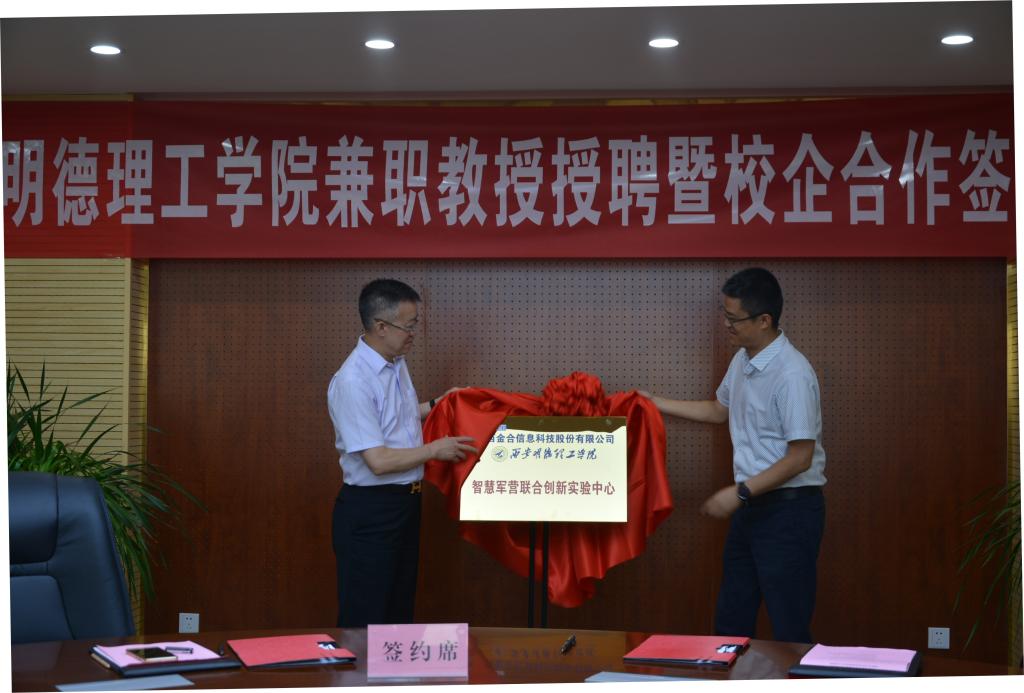 最后,张渤院长与张文泉董事长共同签订了《校企联合人才培养合作协议书》,陕西金叶科教集团股份有限公司集团董事局主席、学院董事长袁汉源先生和陕西金合信息科技股份有限公司董事长张文泉先生共同为智慧军营联合创新实验室揭牌。