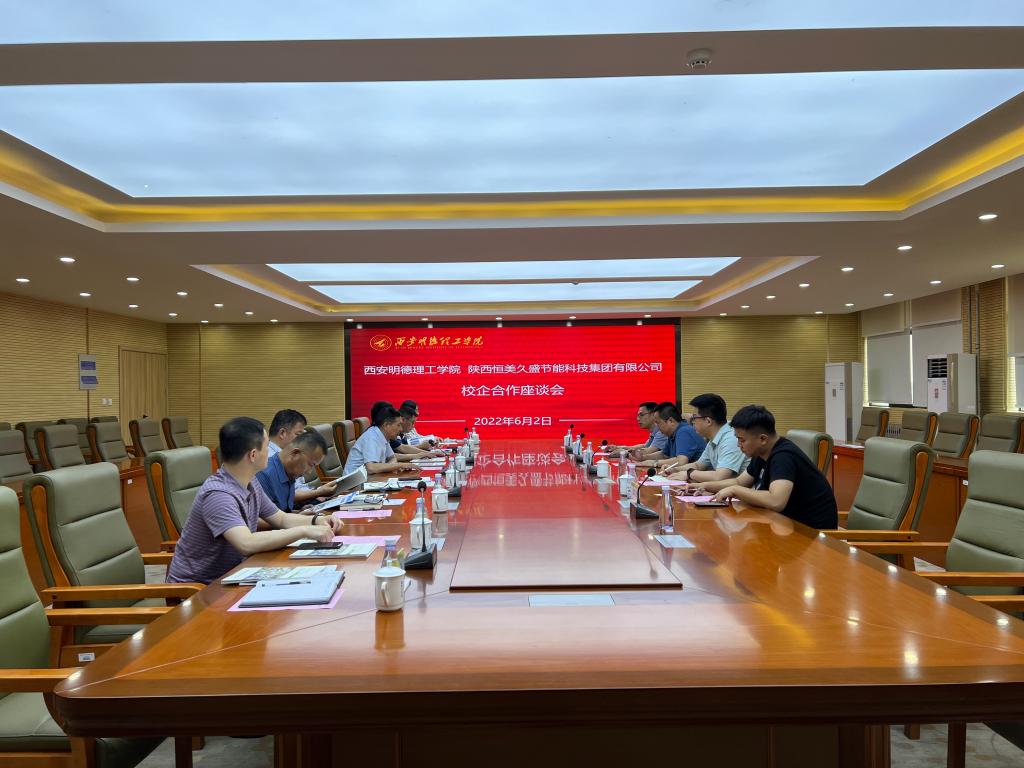 座谈伊始,校长杨健君代表学校对来访企业人员表示欢迎,与会人员一同观看了ac米兰官方网站宣传视频。紧接着,副校长王斌宁从校园节水、节电和节能等3个方面介绍了ac米兰官方网站绿色校园建设概况;陕西恒美久盛节能科技集团有限公司董事长盛春雨从集团板块、业务板块及校企合作成功案例等3个方面介绍了企业概况及节水型校园建设方案。随后,校企双方围绕绿色校园建设、智慧校园建设、实习实训基地建立、产学研合作等事项进行深入交流探讨,气氛热烈融洽。