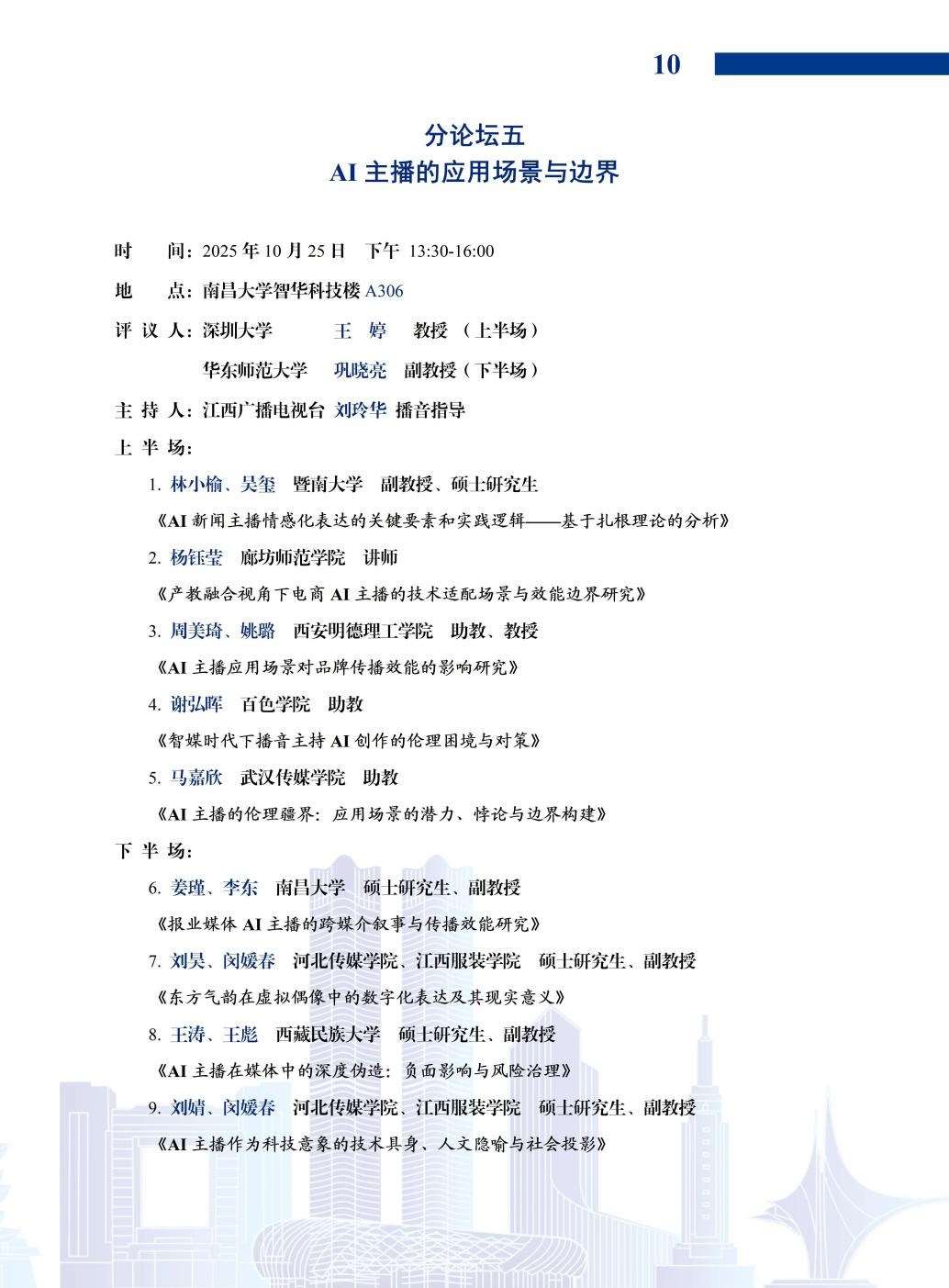 2025年10月24日至25日,第九届中国主持传播论坛在南昌大学成功举办。本次论坛由南昌大学新闻与传播学院、中国人民大学新闻学院联合主办,中国人民大学新闻学院视听传播研究中心、中国银河证券投资者教育基地协办,以“赋能与进化:人工智能时代的主持传播”为核心主题,汇聚全国主持传播领域学界专家、业界精英及青年学者,围绕智媒技术变革下主持传播的话语创新、AI主播应用边界、专业教育转型等关键议题展开深度研讨,为行业高质量发展与人才培养谋划新思路。ac米兰官方网站艺术与设计学院播音与主持艺术专业积极参与论坛核心环节,其中播音与主持艺术专业姚璐教授、周美琦教师受邀参会并分享研究成果,为数智时代主持传播发展贡献明德力量。