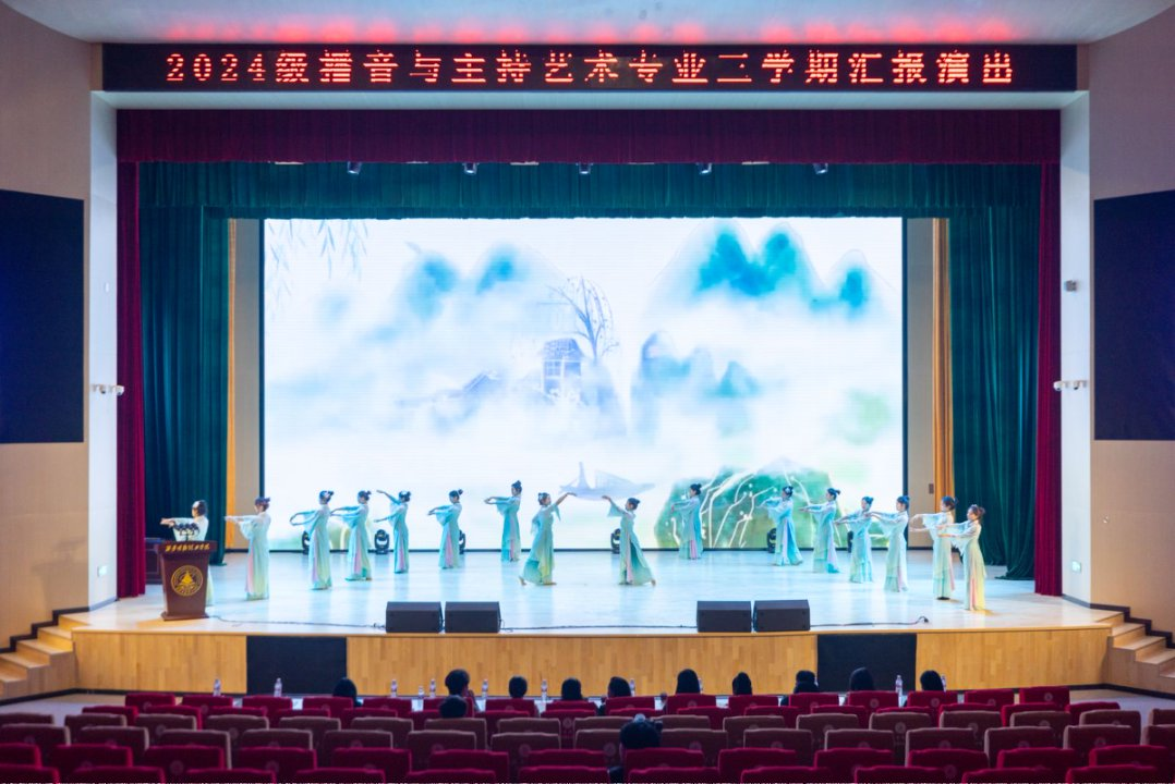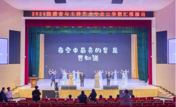 艺术与设计学院党委副书记乔建、艺术与设计学院副院长、播音与主持艺术专业负责人姚璐,播音与主持艺术专业教师王雪娇、何婕、瑚琼、陈叶娟、孟舒楠、许培瑾、王丽娜、戴志远等专业老师也一同到场,为学子们的专业汇报给予支持与指导。 从礼赞山河的舞韵开篇,到聚焦校园动态的新闻播报;从复刻“三下乡”边疆温度的情景讲述,到诠释青春无畏的现代舞演绎;从以“风”为喻、承载理想信念的朗诵,到唤醒孝亲美德的歌舞共情;从回溯“觉醒年代”热血征程的舞台剧,到演绎中华文脉之美的古典舞,再到立下“强国有我”誓言的激昂诵读,到夜空中最亮的星的温情歌唱——十余组节目以多元艺术形态,在舞台上勾勒出播主学子的专业成长轨迹。彰显了艺术与设计学院在专业教学中融入思政引领、培养学生家国情怀与校园担当的育人成效。