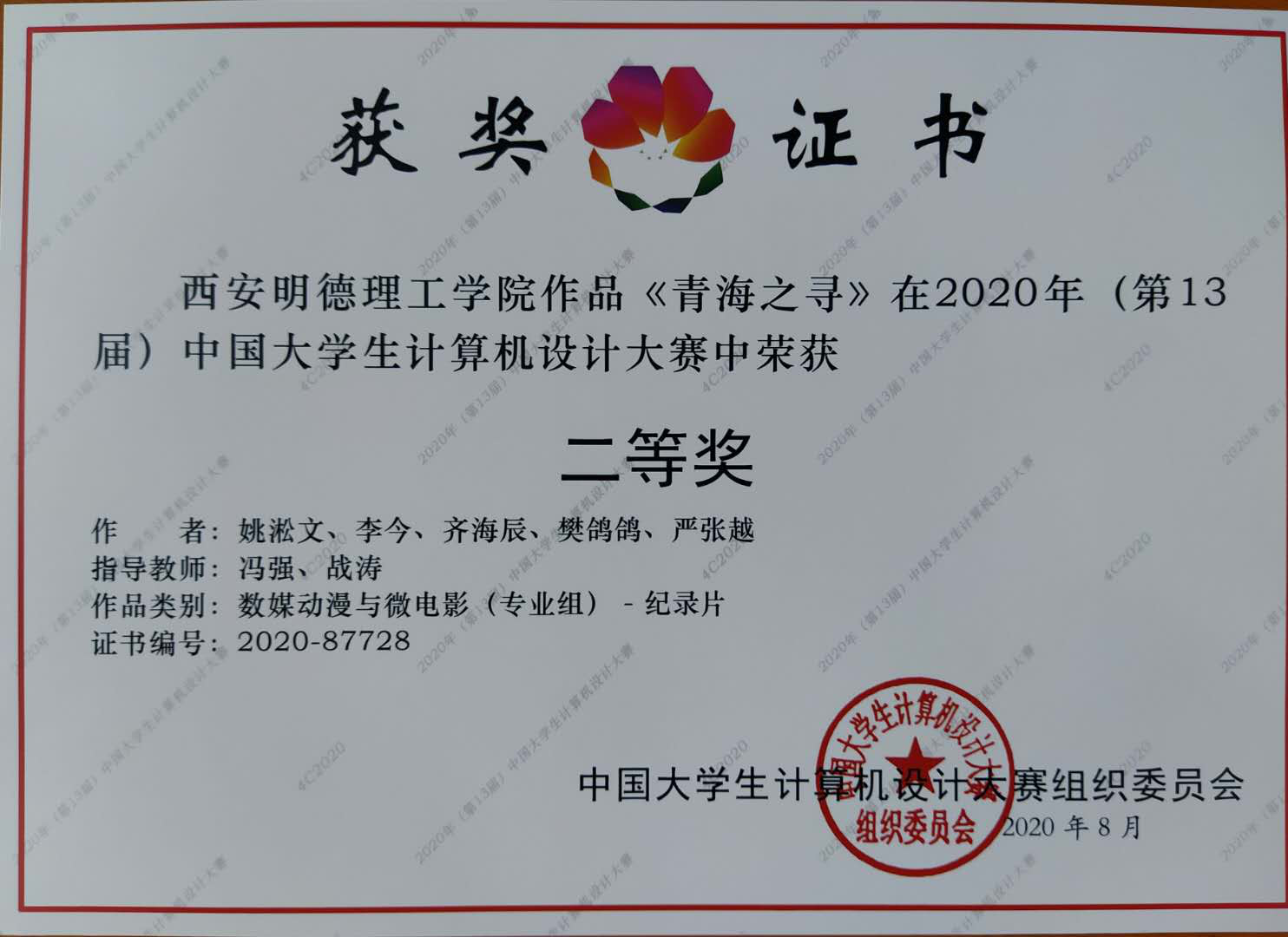 经过西北赛区严格审核,艺术与设计学院有3组作品推荐进入国家级比赛。在2020年7-8月,决赛是以线上答辩讲解的形式由厦门大学和山东大学承办。最终,《青海之寻》获得二等奖;《小小鸟》和《反家暴,不可说》获得三等奖的佳绩。以下是获奖详情。