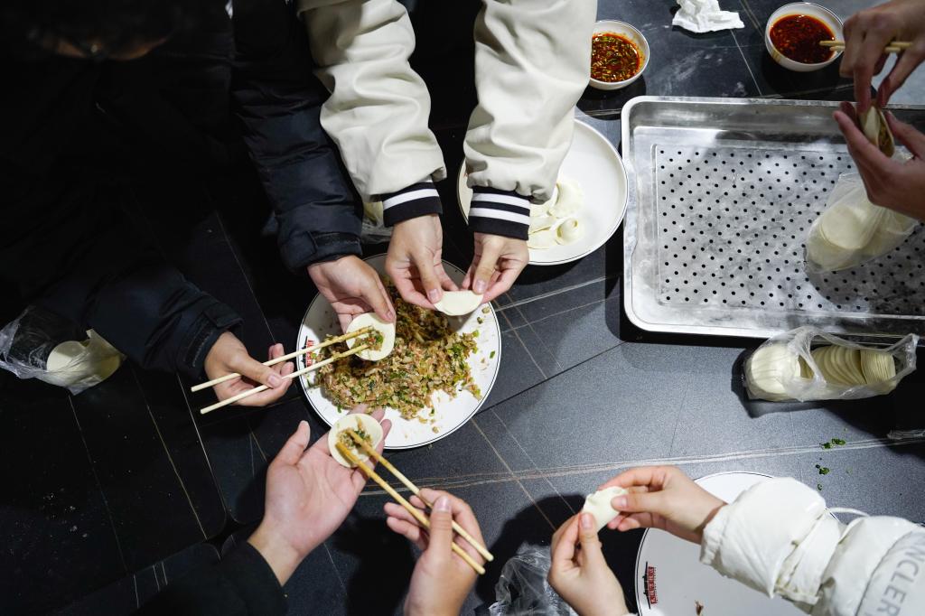 过程中,同学们喜笑颜开,在你一言我一语中,大家托住饺子皮、取一勺饺子馅、捏好饺子皮、一个个个性十足的饺子就诞生了。每个人脸上都洋溢着灿烂的笑容,大家相互传授包饺子的经验,在欢乐的氛围中大显身手,充分的展示了自己的手艺。同学们别出心裁的把饺子包成各种形状,饺子的摆放也错落有致,别具艺术气息。由于各个地方包饺子的包法不同,不同地域的同学相互学习不同包饺子的包法。现场气氛格外热闹,经过共同努力,各式各样的饺子呈现在大家眼前。