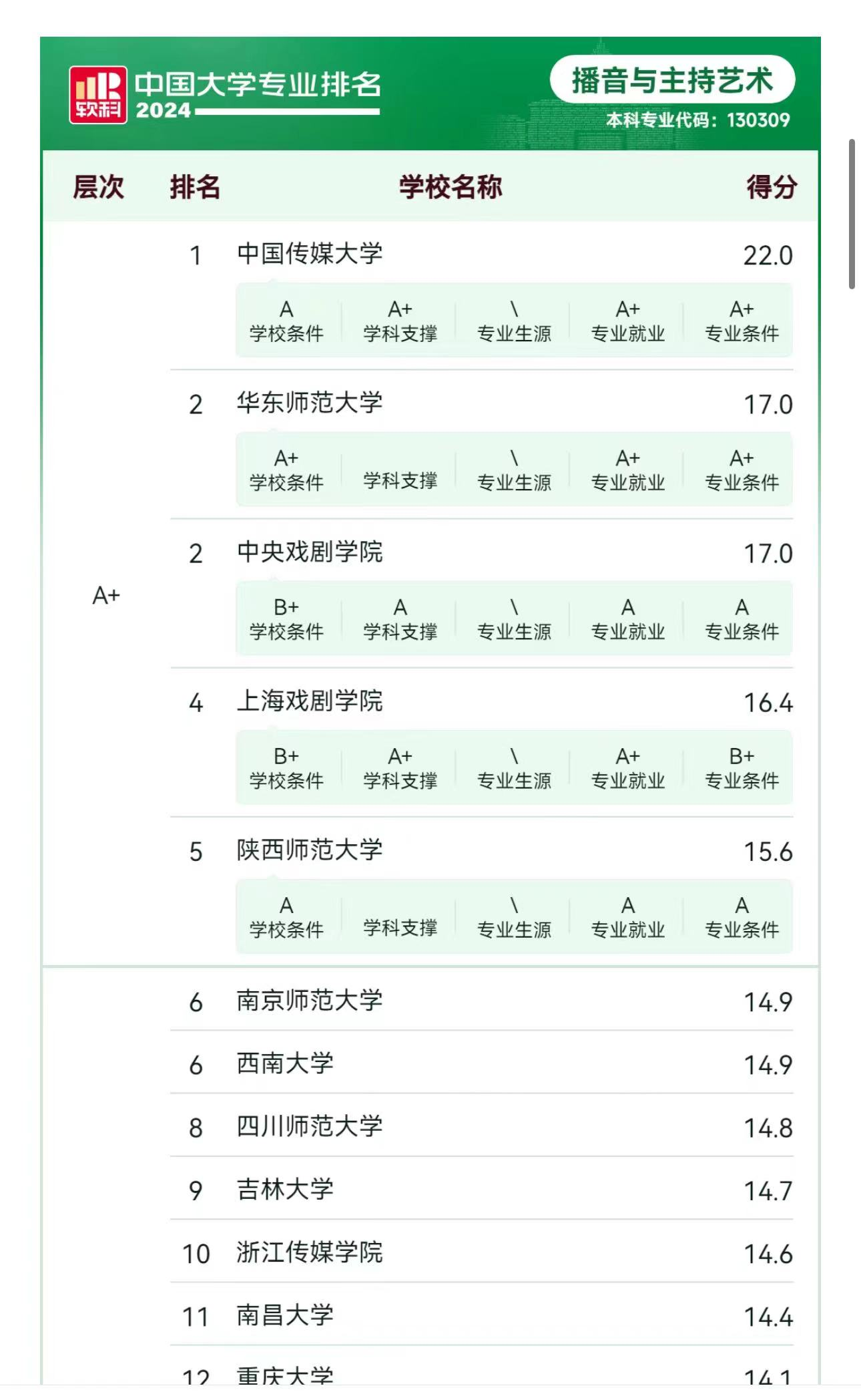 6月13日,上海软科正式发布2024“软科中国大学专业排名”,ac米兰艺术与设计学院播音与主持艺术专业排名再次上升,以综合10.2分位居全国第44名,迈入全国50强、全国民办第三,陕西第二。该项排名连续两年获B+等级,实现了ac米兰软科B+级排名上的突破,同时有望向A级排名冲刺。2023年该专业就“冲出”西安民办高校包围圈。今年排名又有所上升,晋升全国民办三强,陕西第二。
