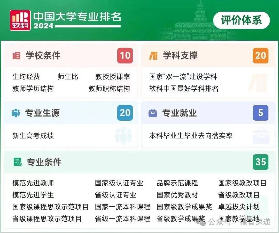 软科中国大学专业排名包括810个专业,涉及93个专业类、12个专业门类,是迄今为止覆盖专业数量最多、参评专业规模最大的中国大学本科专业排名。专业综合等级B(全国排名前30%-50%)以上的学校和专业才能上榜,排名指标体系设置学校条件、学科支撑、专业生源、专业就业、专业条件5个指标类别,共25项观测指标。