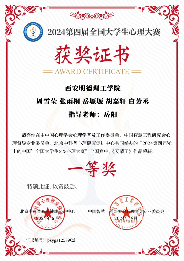 此次获奖不仅是对我院辛勤付出的肯定与鼓励,更是对学院对“教在明德、学在明德”教育理念的生动诠释。相信在未来的日子里,明德学子们将继续创作更多优秀的作品,为推动心理健康知识普及、提高大学生心理健康水平贡献自己的力量。同时,也期待更多的作品能够关注大学生心理健康以问题,共同营造一个健康、积极、阳光的校园环境。