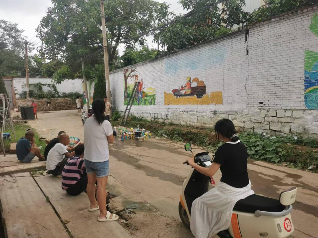 画笔和笔刷在墙面上跳跃,同学们相互配合,有的负责调色,有的负责打底,有的负责修饰细节,炎炎烈日下大家汗流浃背,一画就是半天。墙面从白色变得生动形象,在同学们的笔下有了灵气,向人们呈现出一幅幅乡村振兴的新画卷。