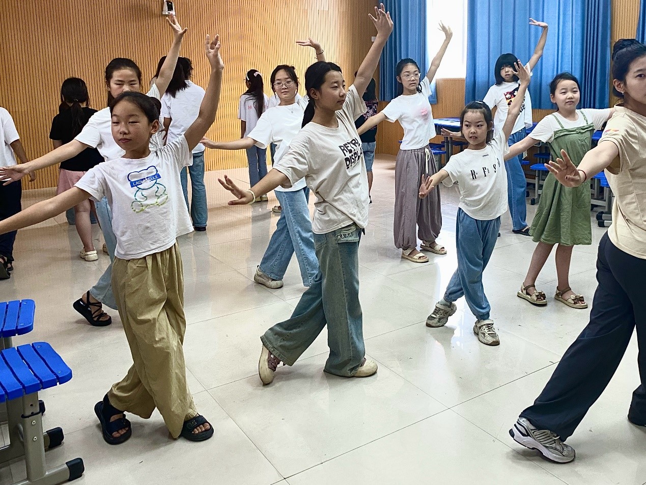 随着节奏鲜明的现代音乐响起,孩子们又投入到当代舞的学习中。当代舞以其自由、开放、创新的特点,让孩子们在舞动中释放天性,展现青春活力。“小”老师通过生动有趣的讲解和示范,引导孩子们感受音乐的节奏和旋律,激发他们的创造力和想象力。孩子们在欢快的音乐中尽情舞动,他们的动作虽然稚嫩,但充满了朝气和活力。