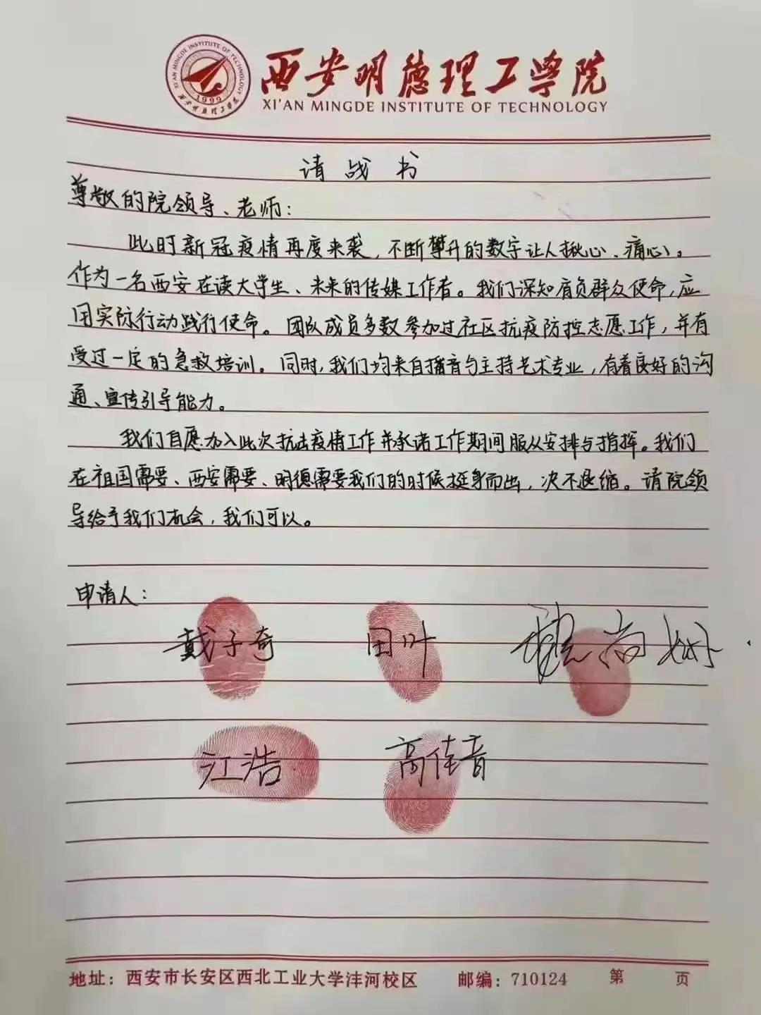 2021年12月末,西安正在接受着疫情重重考验,一群在外求学的西安学子也同样正在接受着疫情的考验!一封封充满热血的请战书也代表了ac米兰官方网站艺术与设计学院莘莘学子同心抗疫的决心与勇气。