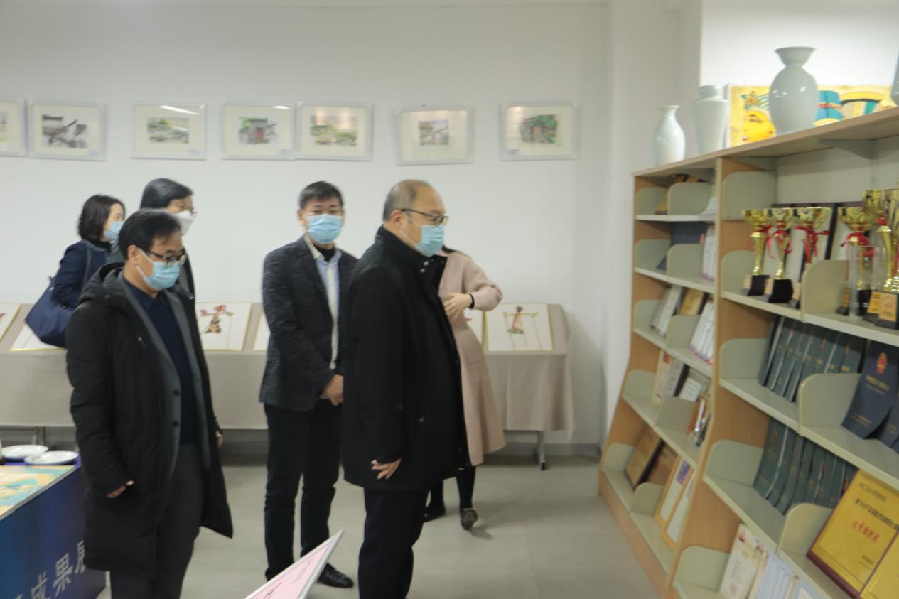 见面会结束,在学院副院长冯强、专业负责人的陪同下,专家组考察学校教学成果展,艺术与设计学院实验室并随机进教室听课、看课,深入了解学院办学条件和教师授课情况。