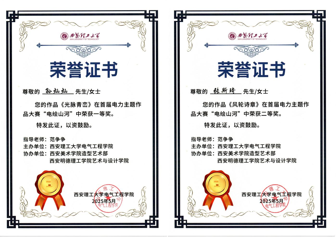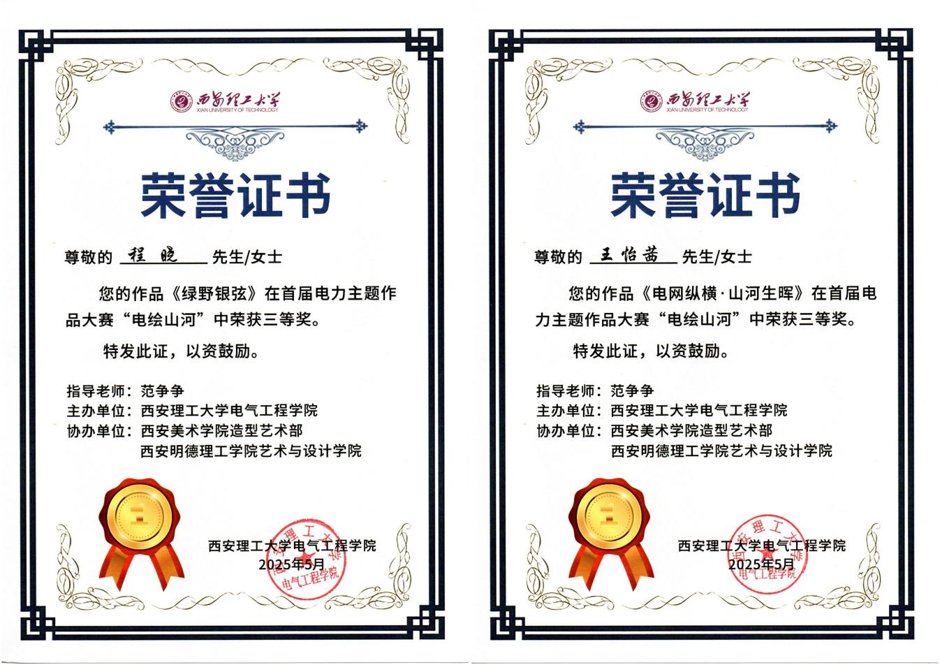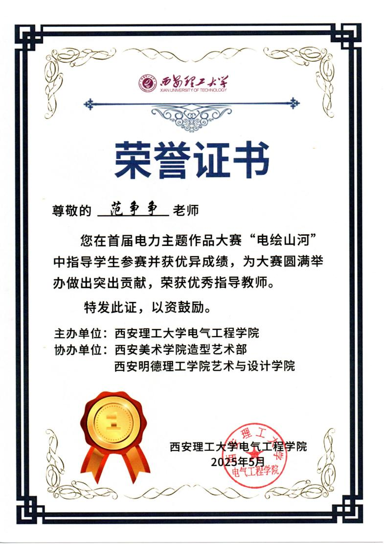 本次大赛自4月份启动以来,艺术与设计学院师生精心备赛。视觉传达设计专业教师范争争悉心指导,孙灿灿、张慈瑞、张斯琦、张悦悦、程晓5名学生以扎实的专业功底和创新的设计理念,在众多参赛作品中脱颖而出,荣获佳绩。艺术与设计学院学生以笔墨丹青为媒介,用一幅幅精美的作品勾勒出新中国成立以来电力行业发展的光辉历程、辉煌成就以及宝贵经验,彰显了学院在艺术设计领域的教学成果与实践实力。