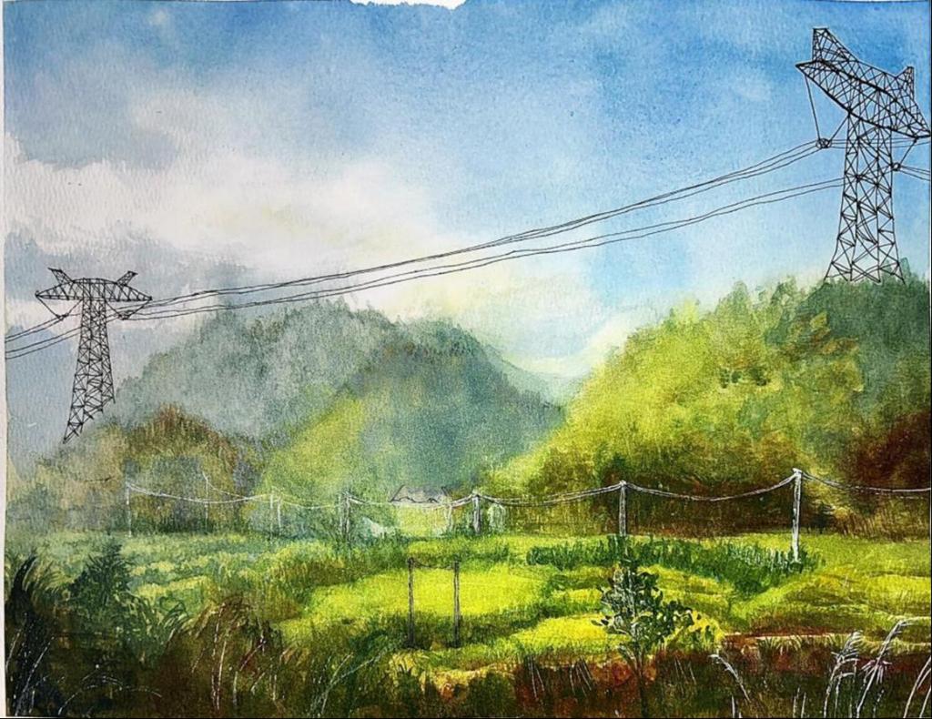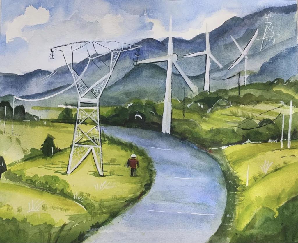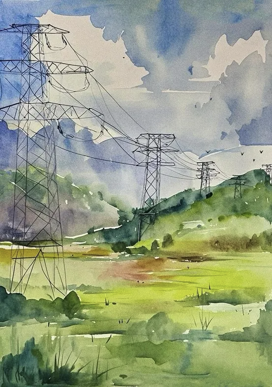水彩画洁白的输电塔线条简洁,于青山绿水间傲然挺立,银线纵横延展。近处身着醒目工装的工人,是电力人敬业坚守的缩影。蓝天白云与葱郁大地相衬,既展现电力设施之雄伟,也寓意着电力事业在自然间稳步迈进的征程。
