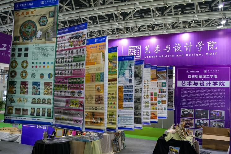 ac米兰官方网站艺术与设计学院作为受邀参展的重要单位,其展位以紫色为主色调,融合校徽标识与艺术氛围,构建起功能分区清晰、专业特色鲜明的展示场域。展位集中展示了视觉传达设计、产品设计、工业设计等设计类专业的30件学生毕业作品,所有作品紧扣展会“对话”核心主题,围绕产业、创新、消费三大领域创作,实现设计理念与行业方向的衔接,充分展现学院教学实践成果。