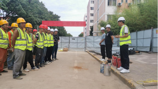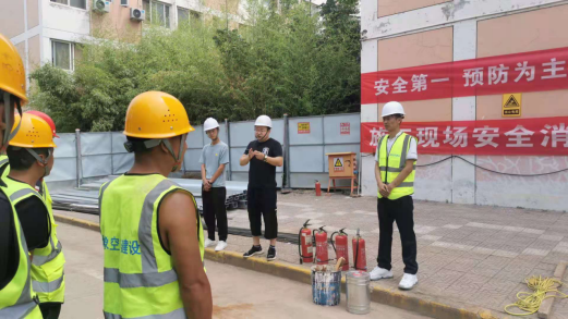 施工单位负责人王晓栋就如何观察灭火器是否有效,如何正确使用灭火器以及发生触电后如何立即切断电源和紧急施救对现场施工人员进行了讲解。在讲解培训后由现场施工人员实际演练操作。