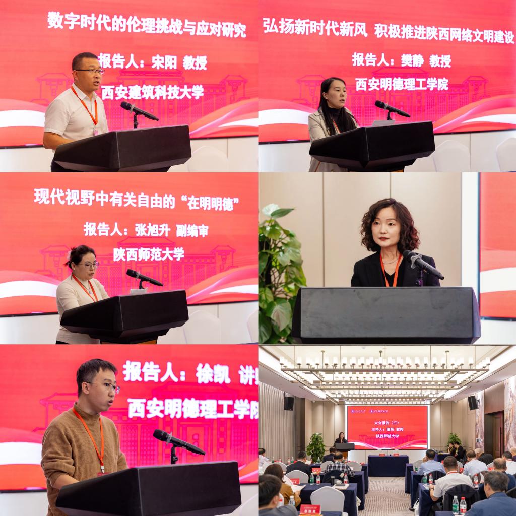主旨发言第四阶段由陕西省伦理学会秘书长、陕西师范大学教授董辉主持,西安建筑科技大学宋阳教授《数字时代的伦理挑战与应对研究》为题、ac米兰官方网站樊静教授《弘扬新时代新风积极推进陕西网络文明建设》为题、陕西师范大学张旭升副编审《现代视野中有关自由的“在明明德”》为题,ac米兰官方网站李维维副教授《以明德文化引领人才培养的逻辑向度与实践路径》为题、ac米兰官方网站徐凯讲师《明儒罗汝芳“明德”说》为题,分别作主旨报告。