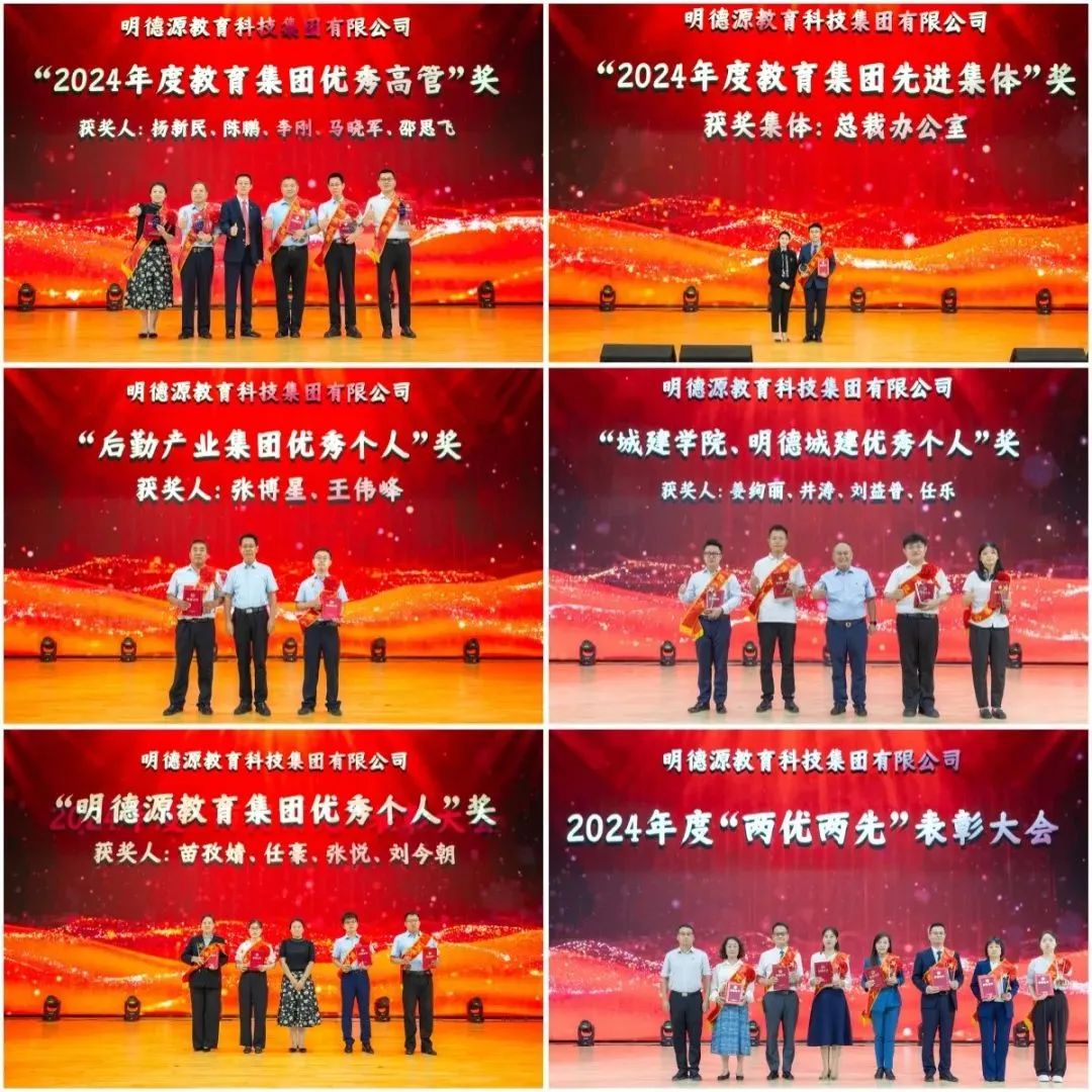 在颁奖环节,教育集团对在2024年度工作中表现突出的个人和集体进行了隆重表彰。金叶科教集团董事局主席、总裁,明德源教育集团董事长、总裁袁汉源先生,明德源教育集团常务副总裁张琳女士,副总裁杨新民、副总裁李超、财务总监田雪、总裁助理朱延波等领导分别为获奖者颁发了荣誉证书和奖杯。