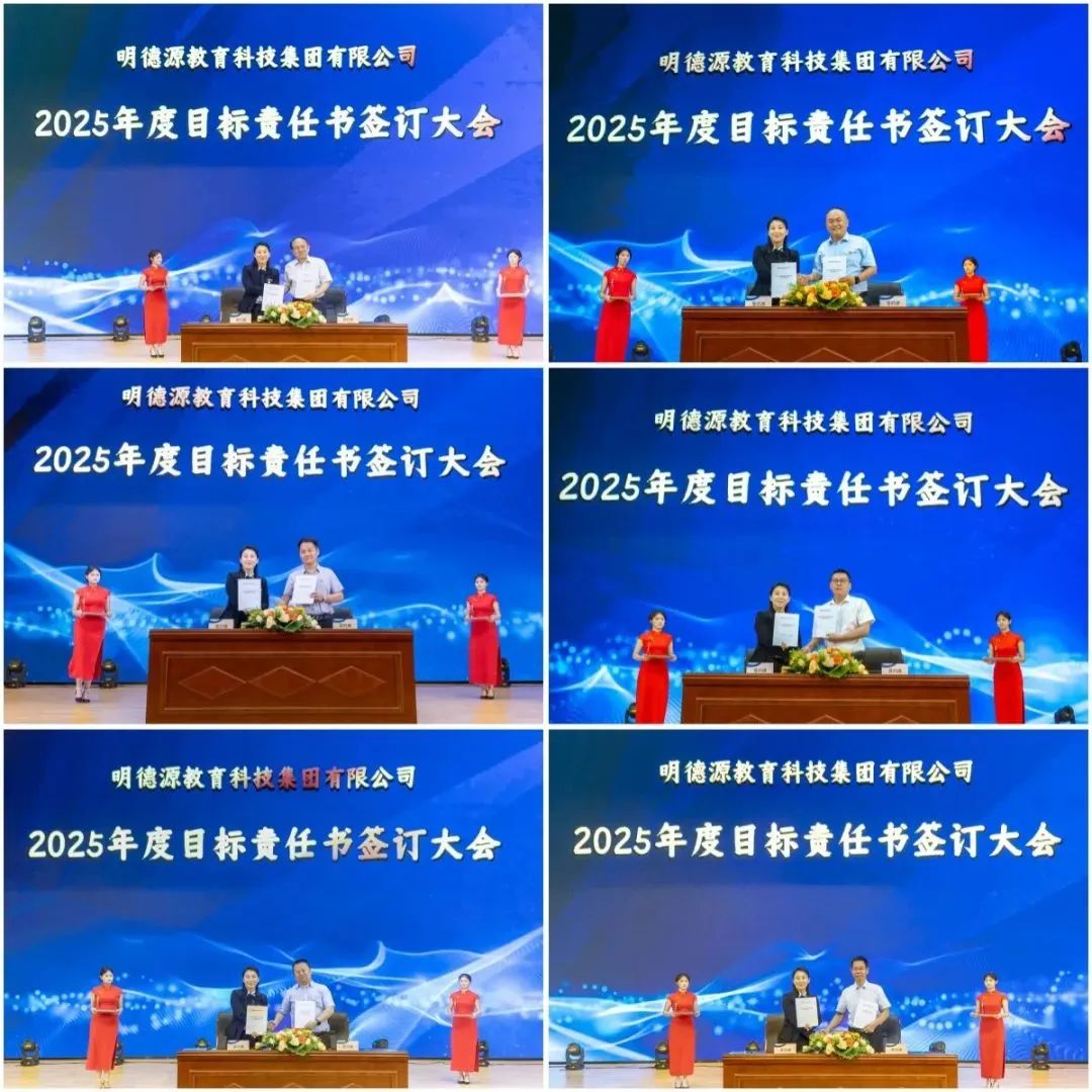 在2025年目标责任书签订仪式上。张琳女士与各单位负责人签署了目标责任书。她强调,此次签订目标责任书是“排兵布阵、擂响战鼓”,以“军令如山”的魄力向2025年目标任务发起冲锋。这一纸责任状签下的不仅是数字与指标,更是教育集团“开疆拓土、使命必达”的铮铮誓言!