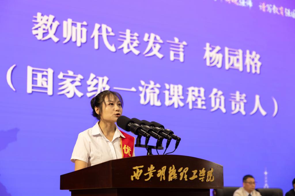 随后,国家级一流课程负责人、信息工程学院杨园格副教授作为教师代表发言,从弘扬践行教育家精神、躬耕教育教学实践、助力评建攻坚和评估达标三个方面,表达了投身教书育人使命、推动学校高质量发展的赤诚之心。