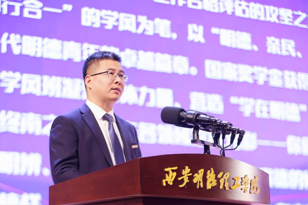 他从个人成长、集体建设、专业提升、实践育人等方面回顾了过去一年校园里学生的榜样故事,并从“立大志、明大德、成大才、担大任”四个维度寄语青年学子:一要坚定理想信念,在成才报国中把准人生航向;二要锤炼品德修为,在砥砺品格中涵养高尚情操;三要加强专业学习,在精进学业中夯实担当根基;四要勇于担当作为,在投身评估中展现青春风采。他希望全体明德学子以受到表彰的先进典型为榜样,将个人理想融入国家发展与学校评建大局,秉承明德人精神特质,践行社会主义核心价值观,利用优质教学资源提升实践与终身学习能力,以主人翁姿态投身评估工作,规范言行、建言献策,共同书写学校高质量发展新篇章,努力成长为堪当民族复兴大任的时代新人。
