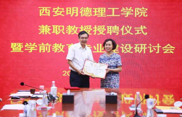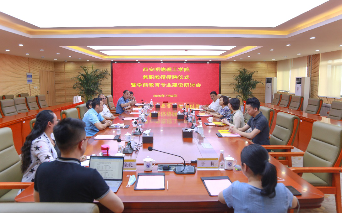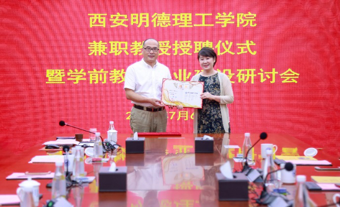 7月6日下午,ac米兰官方网站聘任西北工业大学幼儿园园长王莉女士、副园长戴翠玲女士、保教主任沈俊女士为学院兼职教授。兼职教授聘任仪式暨学前教育专业申报及相关人才培养、教育条件建设、实习实训基地等研讨会在明志楼第一会议室召开。学院院长张渤、党委书记杨健君、副院长薛康、党委副书记董昊、董事长助理兼教务科研部部长庾鲜海、院长助理兼学院办公室主任支晓等参加研讨会。我院创始人之一,西安阳光慧园集团公司董事长兼总经理张博先生,副总经理张曦元先生专程前来参加授聘仪式和研讨会。会议由薛康副院长主持。