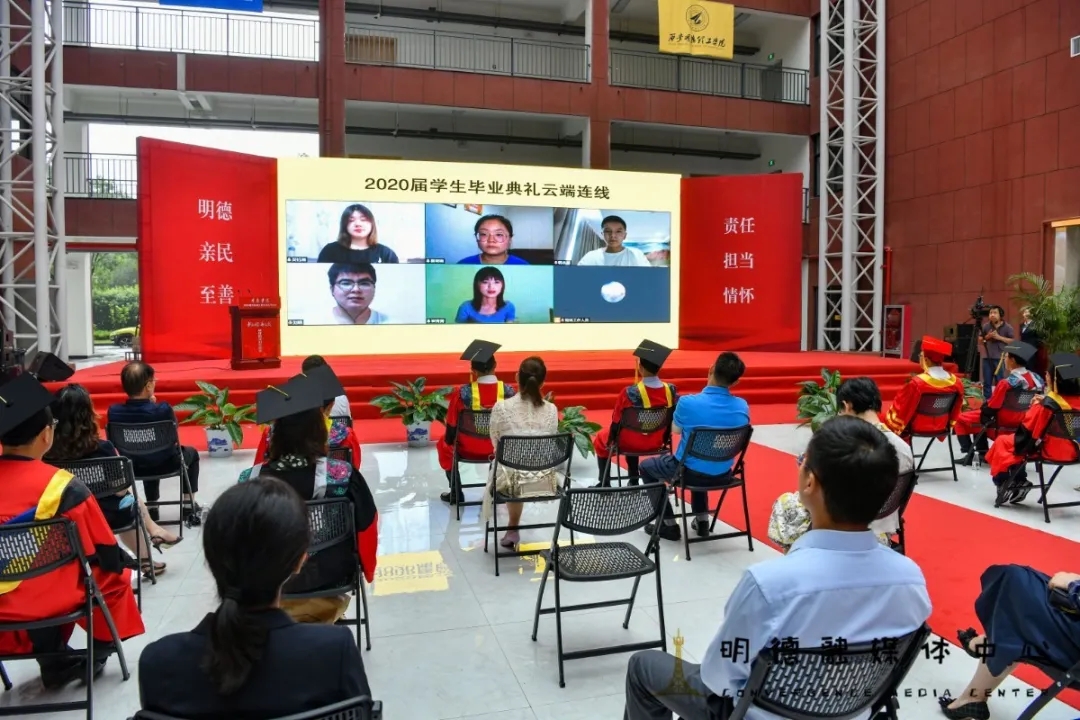 全国教学名师葛文杰等教学名师通过视频形式为2020届毕业生送来诚挚祝福和殷切期望;并通过视频的方式与“云端”毕业生进行了互动连线,倾听了毕业生对明德的眷恋之情。