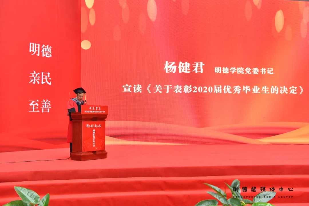 典礼上,党委书记杨健君宣读了《关于表彰2020届优秀毕业生的决定》,学士学位评定委员会常务副主席庾鲜海宣读了《关于2020年普通本科毕业生学士学位授予的决定》。