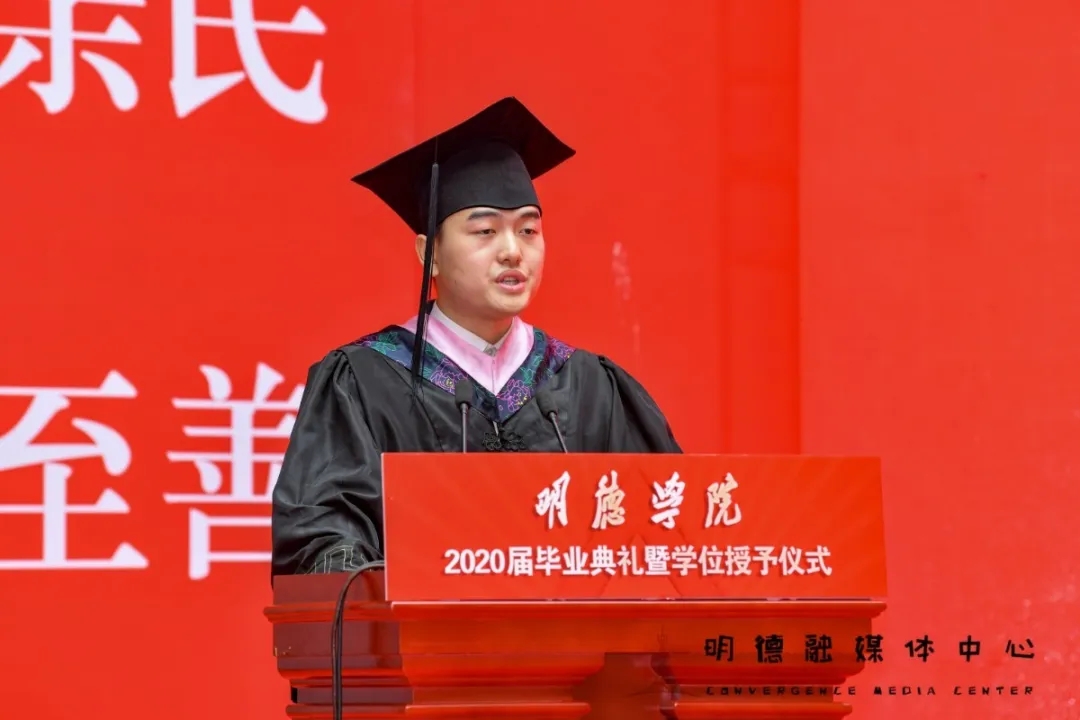 随后,毕业生代表李威和肖嘉旺分别作了发言。李威回顾了自己在明德奋斗成才的历程,感谢母校的培养、老师的教诲和同学们的陪伴,并表示在未来新的岗位上为母校增光添彩。肖嘉旺号召全体毕业生注重防护、安全离校,以身为范、文明离校,铭记校训、感恩离校,调整心态、成就未来。