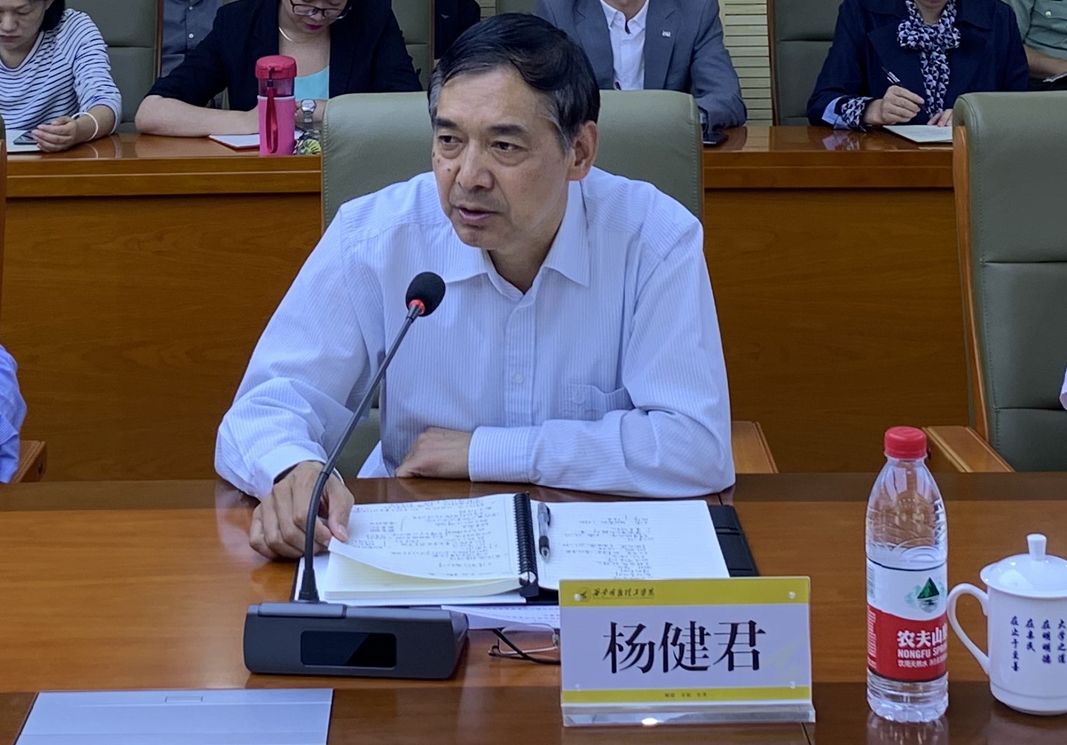杨健君书记作表态发言。他表示,学院将认真传达学习袁董事长讲话精神,贯彻落实对全体教职工的希望和要求,带领学院全体教职员工尽快转变角色定位,不断加强师德师风建设,加强系统性管理,严格自律,爱岗敬业,在董事长及董事会的领导下,在集团公司和西工大的支持下,学院全体教职员工必将团结一致,在学院成功转设的新起点上认真做好各项工作,不辜负集团公司和董事会对学院和全体干部的期望,努力办好一所高质量民办高校,使学院教育事业发展更上一层楼。