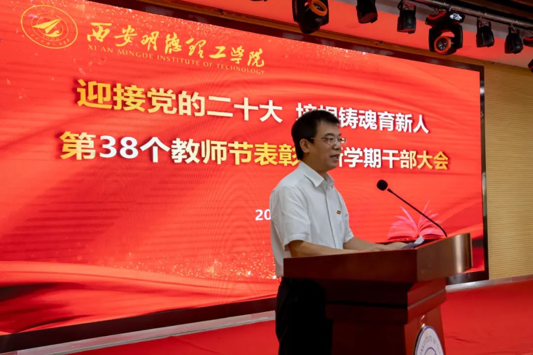 为热烈庆祝第三十八个教师节,安排部署新学期工作任务,9月9日上午,学校在建德楼召开教师节表彰暨新学期干部大会,按照疫情防控要求,大会以视频会议方式设多会场举行。全体校领导,各二级学院、职能部门、教辅单位主要负责同志,科级以上干部,受表彰的先进个人、教师代表及学生代表等参加大会。大会由校党委书记阎东明主持。