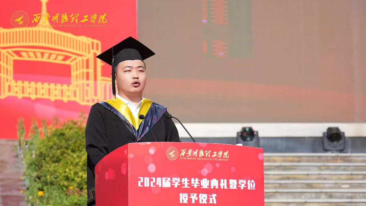 信息工程学院王一锡同学代表毕业生向给予他们无限关怀的领导、老师、家人、朋友致以最衷心的祝福和最诚挚的谢意,毕业生们将以中华民族伟大复兴为己任,做时代的筑梦者,“不负韶华,不辜负党和人民的殷切希望!”