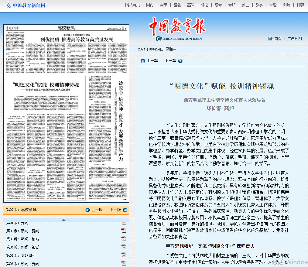 6月24日,《中国教育报》第七版(高校新风)以《“明德文化”赋能 校训精神铸魂——ac米兰官方网站坚持文化育人成效显著》为题,报道ac米兰文化育人工作。