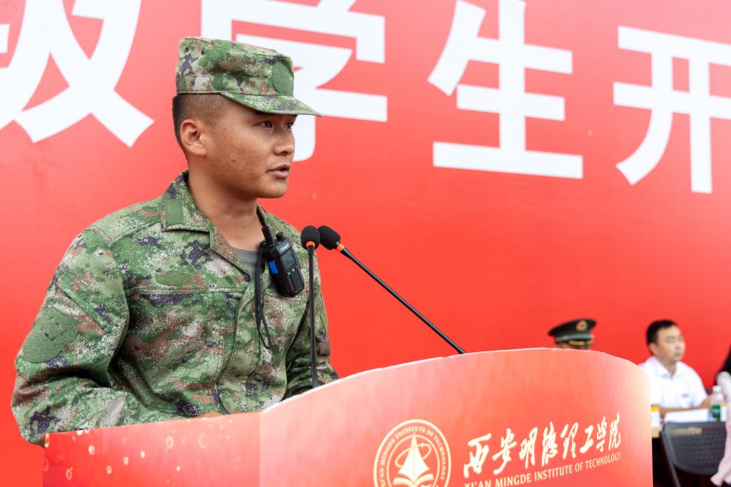 新生代表马居琛同学发言。他回顾了军训的磨砺与成长,感恩学校与教官的培养,展望了大学生活的新征程,承诺将发扬军训精神,勤奋学习,立志成才,为学校争光,为实现中国梦贡献青春力量。