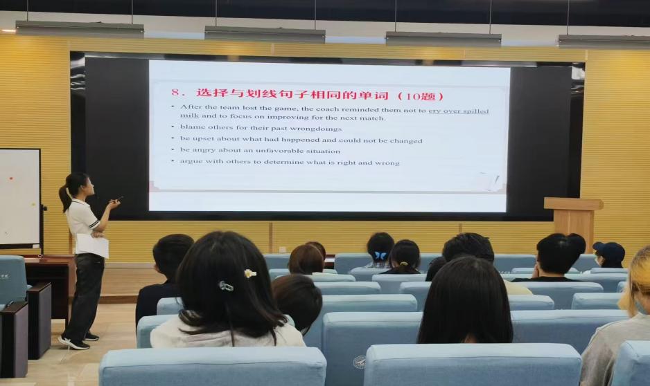 省赛备考阶段,我院为强化学生参赛能力,特别组织4场线下赛前辅导讲座,并同步开展线上指导群答疑,形成“线下讲座精讲+线上资料推送”的立体化备赛模式。讲座内容涵盖词汇高频考点解析、答题技巧训练及历年真题实战等板块,有效提升了学生的词汇深度学习能力与应试水平,进一步夯实了本科教学的基础能力培养目标。