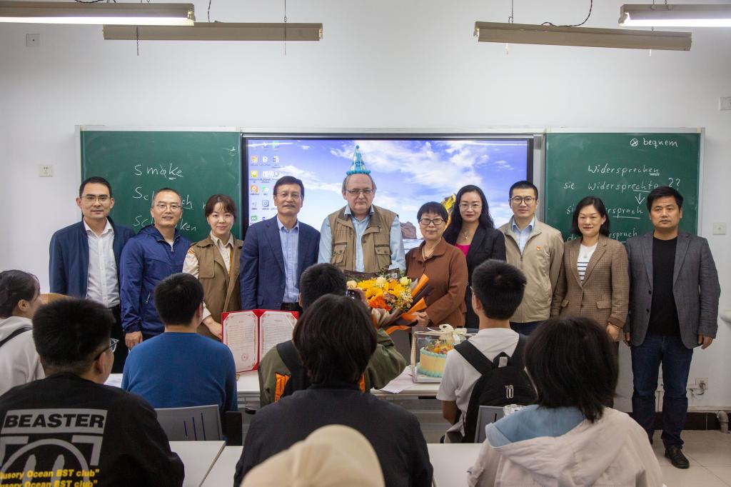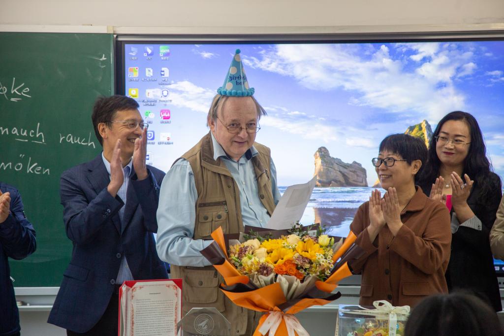5月6日,ac米兰德籍外教Lutz Schridde先生在师生们的祝福中,迎来了64周岁的生日。学校人力资源处副处长康抗、校工会办公室主任蔡文静、国际教育学院院长于艳英、语言文化传播学院领导班子和师生代表来到教室为Lutz送上祝福。