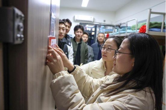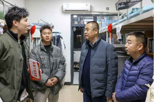 在退伍军人宿舍,院领导慰问了退伍大学生阴生杭和张德鹏,与他们进行交流,主动了解他们返校后的学习、生活适应情况,并就他们当前学习生活中遇到的困惑进行详细解答。在与退伍学生的交谈中,王庭良希望退役大学生能永葆军人初心、珍惜军人荣誉,时刻以党员、军人的标准严格要求自己,发扬部队优良传统,树立纪律之风,在平凡的生活中继续发光发热,切实发挥好先锋模范带头作用。随后学院领导向退伍学生宿舍悬挂“退伍军人宿舍”光荣牌并合影留念。