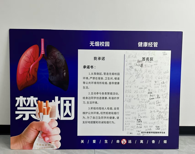在印有“无烟校园 健康经管”标语的倡议展板前,同学们有序参与签名活动。展板以“健康肺”与“受损肺”的鲜明对比图,直观呈现吸烟对身体的伤害;承诺书明确“公共场所不吸烟、主动参与禁烟活动、积极劝阻吸烟行为”三项责任,同学们郑重签下姓名,以行动践行“远离香烟,关爱生命”的誓言。