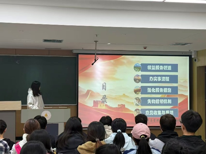 培训会上,权益服务部负责人以“我为同学干实事”为主题,从定义阐释与重要性两大维度展开深度讲解。在定义板块,系统梳理了权益服务的核心内容,涵盖“意见收集与反馈” “失物招领机制”两大模块;在重要性板块,强调其在学校管理中具有“反映学生合理权益”“提升学生生活质量”“构建和谐师生关系”的关键作用,让在场同学对权益工作的值有了更系统的认知。