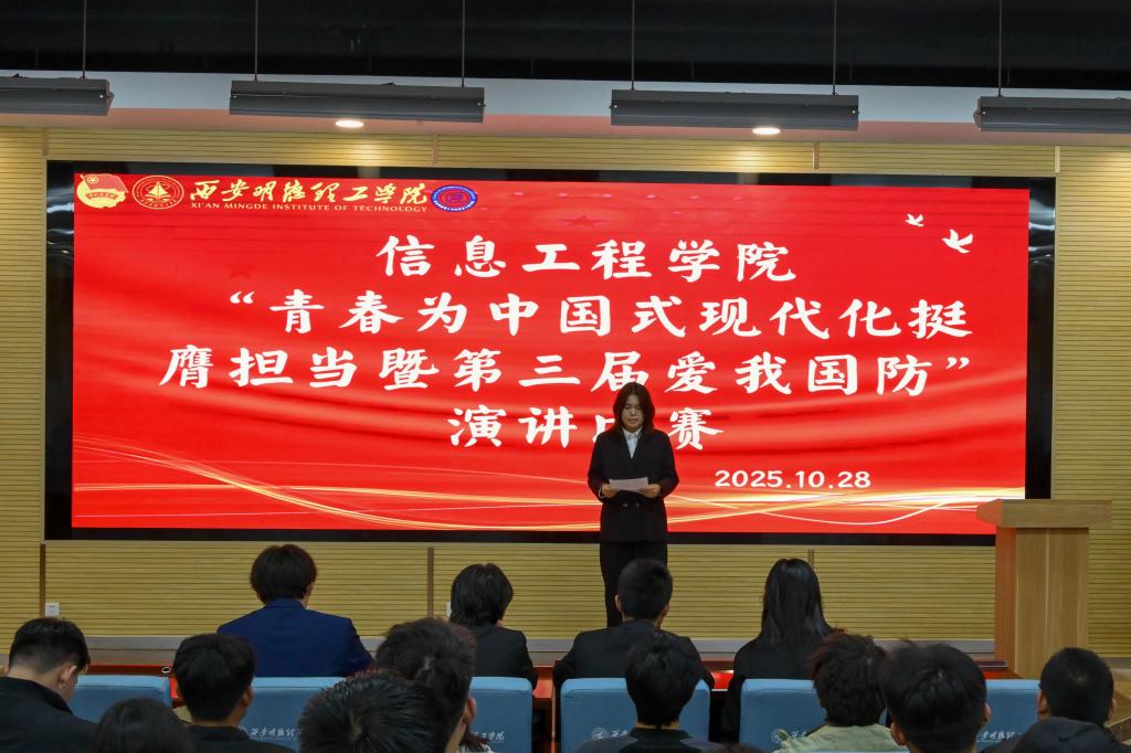 2025年10月22日晚19时,信息工程学院学院在明理楼201报告厅开展以“青春为中国式现代化挺膺担当爱我国防”为主题的演讲活动。