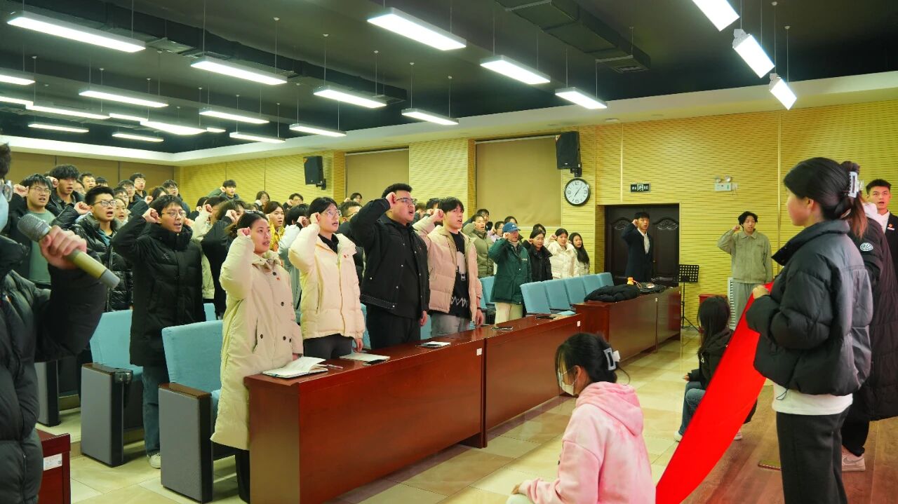 仪式在雄壮的国歌声中拉开帷幕。王佳龙老师宣读新发展团员名单,2025年下半年,经团组织培养考察,信息工程学院共有121名先进青年被发展入团。随后为新团员佩戴团徽,闪耀的团徽象征着五四精神薪火相传。由院团委副书记广炤杞领誓,全体新团员面向团旗庄严宣誓,“为共产主义事业而奋斗”的誓言铿锵激荡,展现出新时代青年传承五四风骨、勇担历史使命的坚定信念。