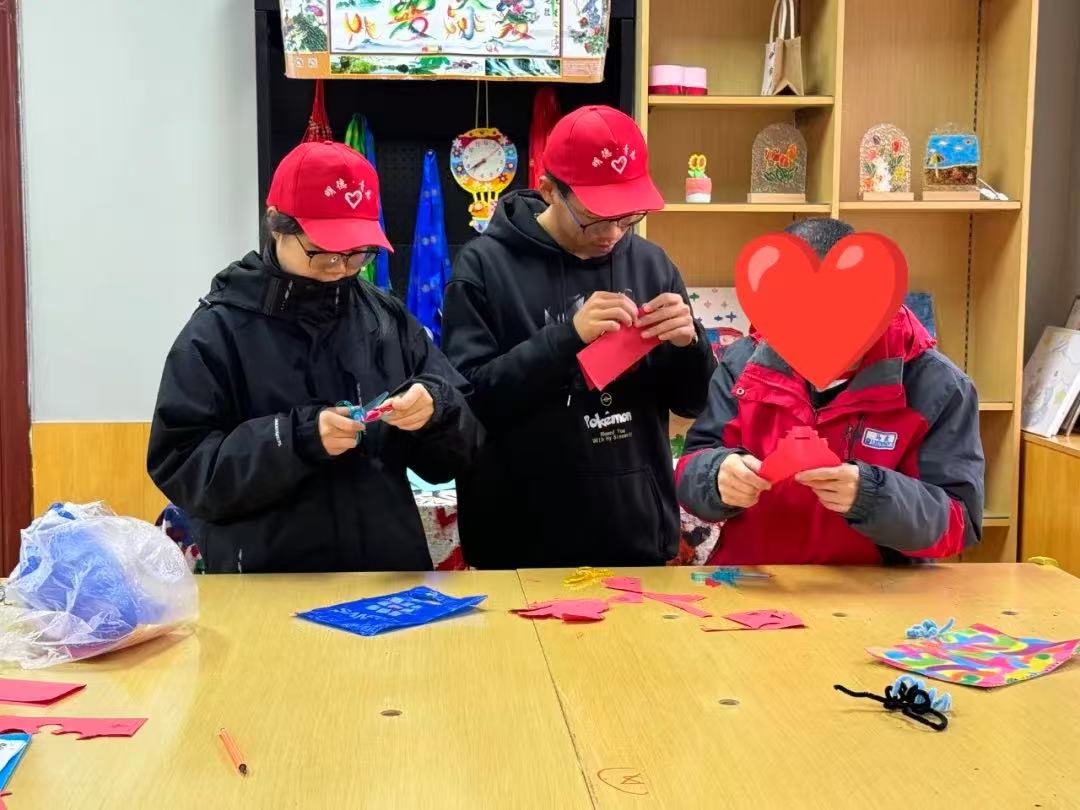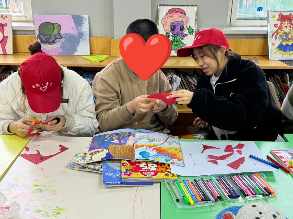 室内活动中,我们与天爱孩子们一同进行手工制作,比如剪纸活动,孩子们在志愿者的引导下感受乐趣,感受那一张张鲜红的卡纸被赋予了鲜活的生命的奇妙。