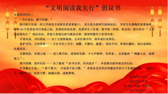 图书馆携手党委组织宣传部、党委学生工作部向全校师生发出文明阅读倡议。