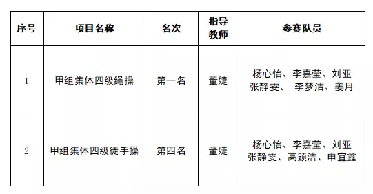经过艰苦训练,同学们充分发扬了艰苦奋斗、勇于拼搏的体育精神。在激烈角逐中,ac米兰在本次大赛中取得了“四级绳操”甲组全国第一名以及“四级徒手”甲组全国第四名的好成绩。