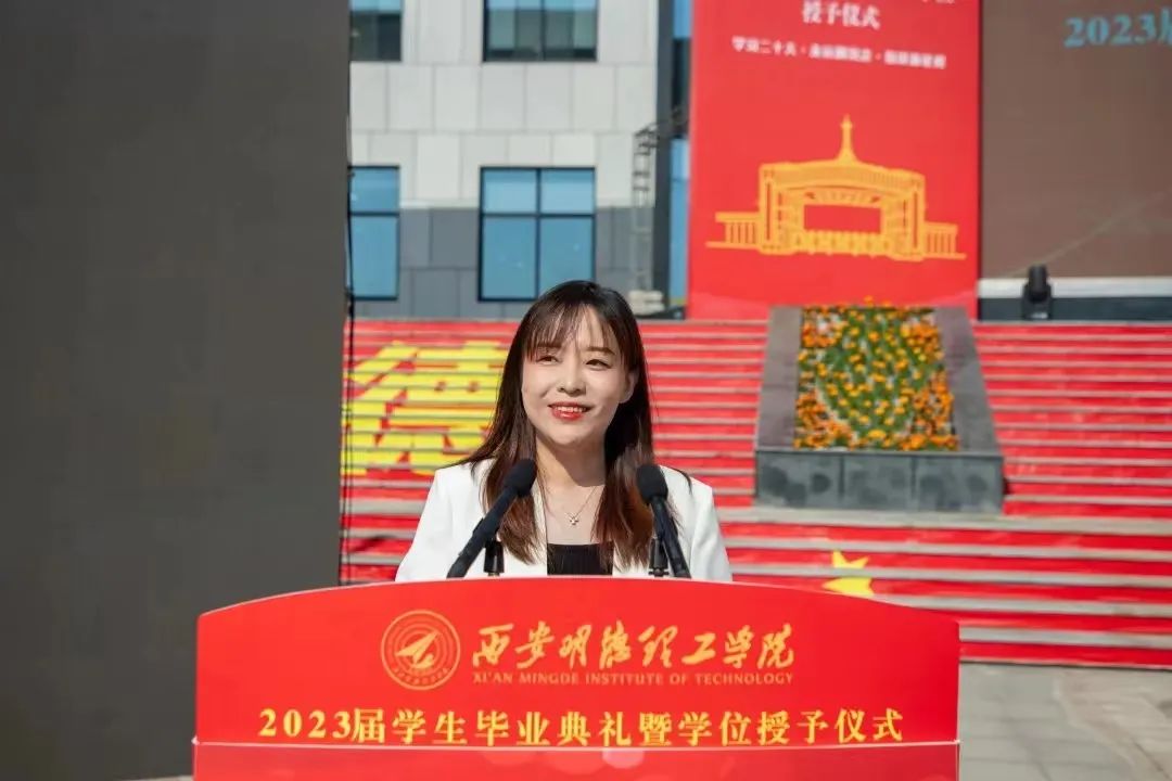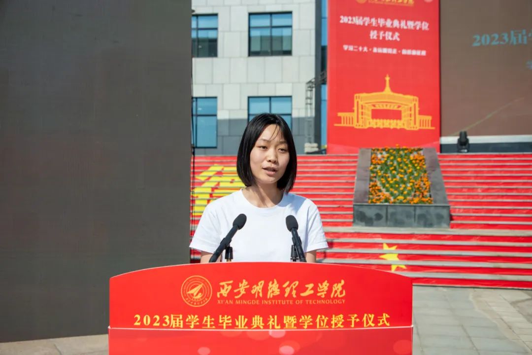 毕业生代表左欣悦同学表达了对母校的诚挚谢意和惜别之情,表示将带着在明德塑造的优良品格、锻炼出的过硬本领、收获到的宝贵学识,踏上新的人生征程,积极向上,志存高远,奉献社会,用拼搏与超越赢得灿烂与辉煌。