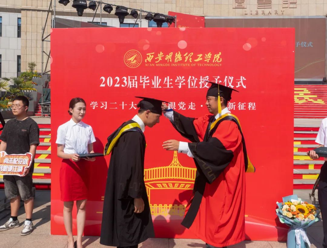 在学位授予仪式上,学校学位评定委员会常务副主席、常务副校长王志刚宣读《关于2023年普通本科毕业生学士学位授予的决议》。袁汉源董事长、全体校领导、校学位评定委员会成员、二级学院院领导为在场毕业生一一拨穗正冠并颁发学位证书,为毕业学子送上最深切的祝福,全场报以热烈的掌声。