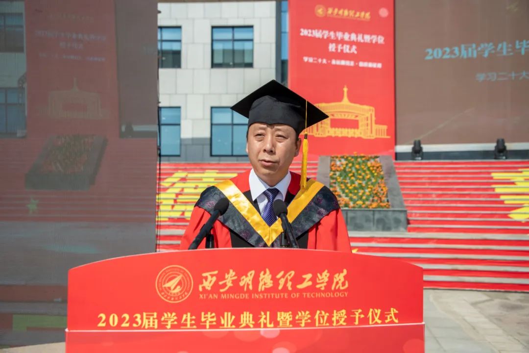 山高海阔再出发,策马逐梦赴未来。6月30日,2023届学生毕业典礼暨学位授予仪式在学校中心广场隆重举行,金叶科教集团董事局主席、总裁,明德源教育集团董事长、总裁,学校董事长袁汉源,学校校长杨健君,党委书记阎东明,明德源教育集团助理总裁张琳,学校常务副校长王志刚、副校长刘星,财务总监马晓军以及学校学位评定委员会成员,各二级学院领导班子,各职能部门负责人,校友代表,毕业班辅导员老师、毕业生家长代表,全体毕业班学生参加典礼。典礼由学校党委副书记董昊主持。