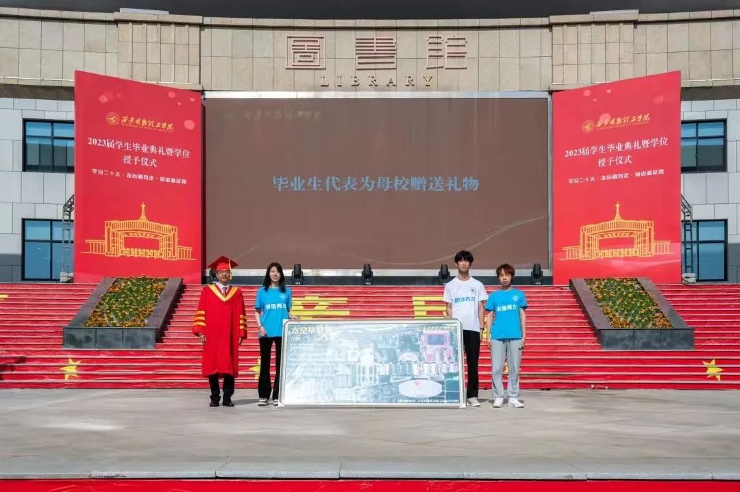 典礼上,2023届毕业生为母校敬赠礼物,礼物是学生们利用在轨的72颗吉林一号卫星组网,为母校拍下的“巨幅太空毕业照”。