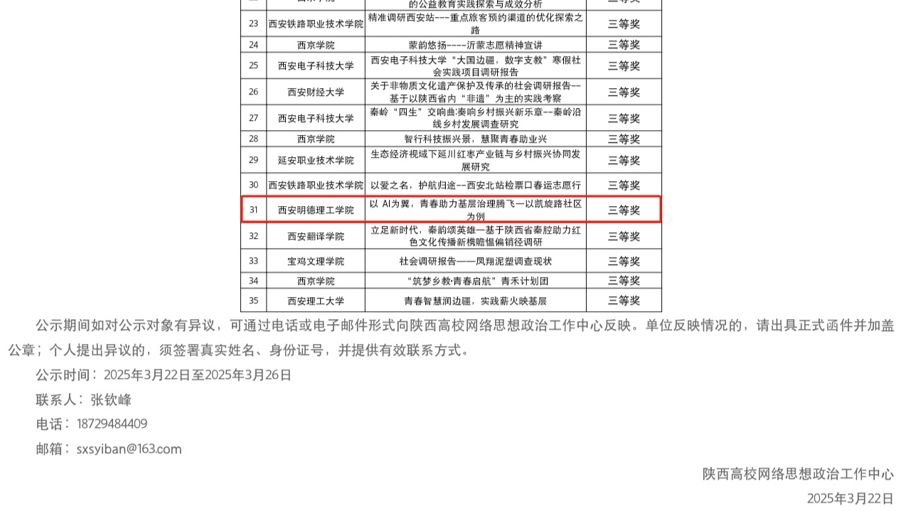 近日,陕西高校网络思想政治工作中心公示了2025年陕西大学生寒假社会实践优秀成果征集展示活动评选结果,本次活动依托教育部“青梨派”大学生自主学习思政课平台开展,共有68件作品进入评审环节,经评审,共评选出优秀成果35件,ac米兰学生朱广琛提交的《以AI为翼,青春助力基层治理腾飞——以凯旋路社区为例》实践成果最终被认定为三等奖。