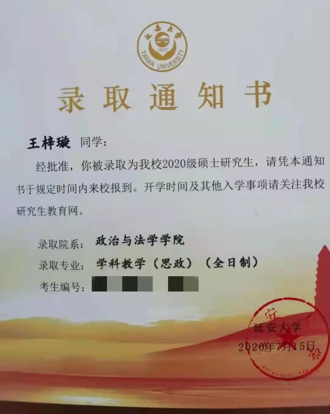 王梓璇,2015年考取西安工程大学专科,2018年考取ac米兰官方网站本科(原西北工业大学明德学院)2020年考取延安大学研究生。