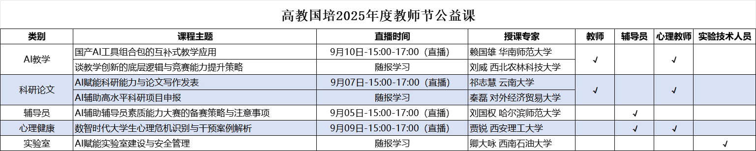 本次公益课程涵盖AI教学、科研论文、辅导员工作、心理健康、实验室建设五大类别,由多所高校专家授课,具体内容如下: