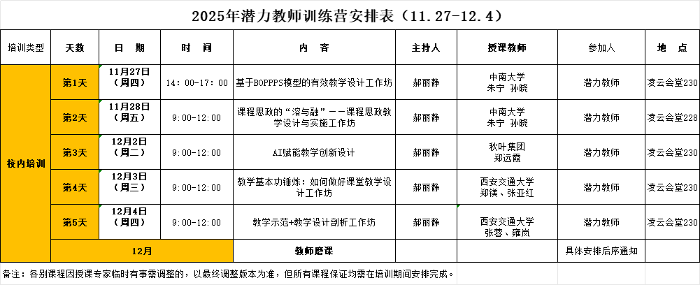 1.理论培训:包含教学设计、课程思政、AI赋能、教学基本功以及教学示范等,重点基于潜力教师基本功赋能。