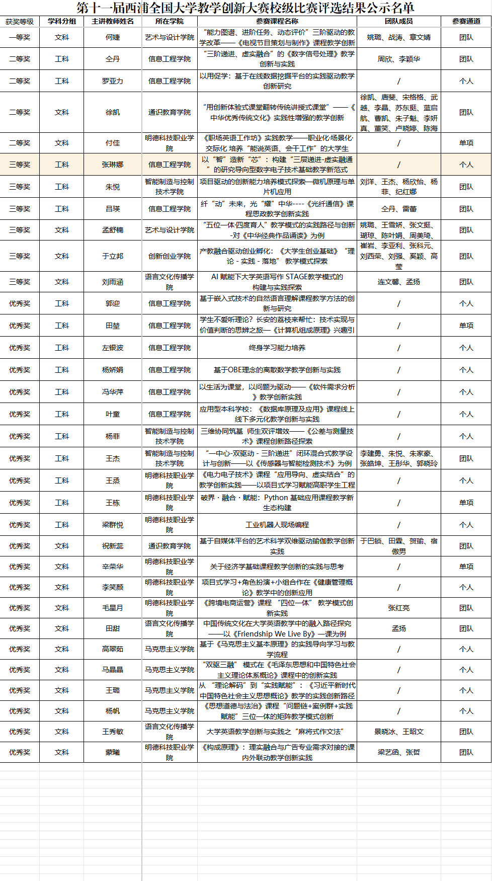 根据《关于举办第十一届西浦全国大学教学创新大赛校级比赛的通知》的相关精神,经各学院推荐、教师个人申报、专家初审及复审等环节,共评选出一等奖2名,二等奖4名,三等奖6名,优秀奖22名。现将第十一届西浦全国大学教学创新大赛校级比赛评选结果进行公示,名单见下图。